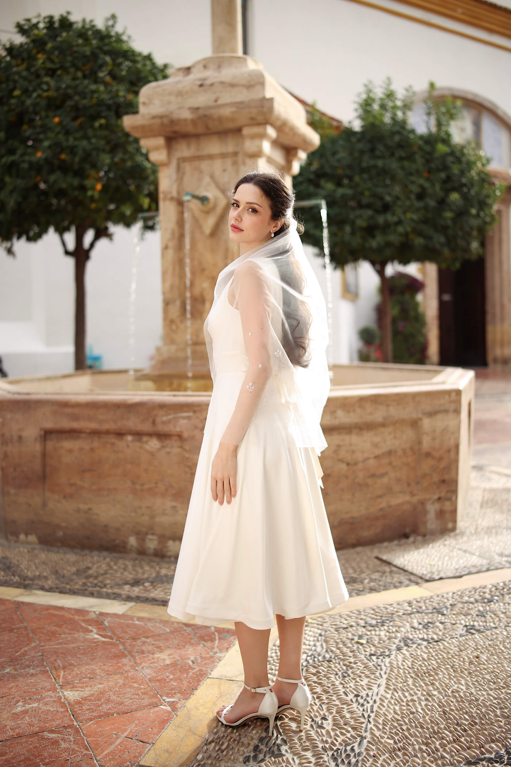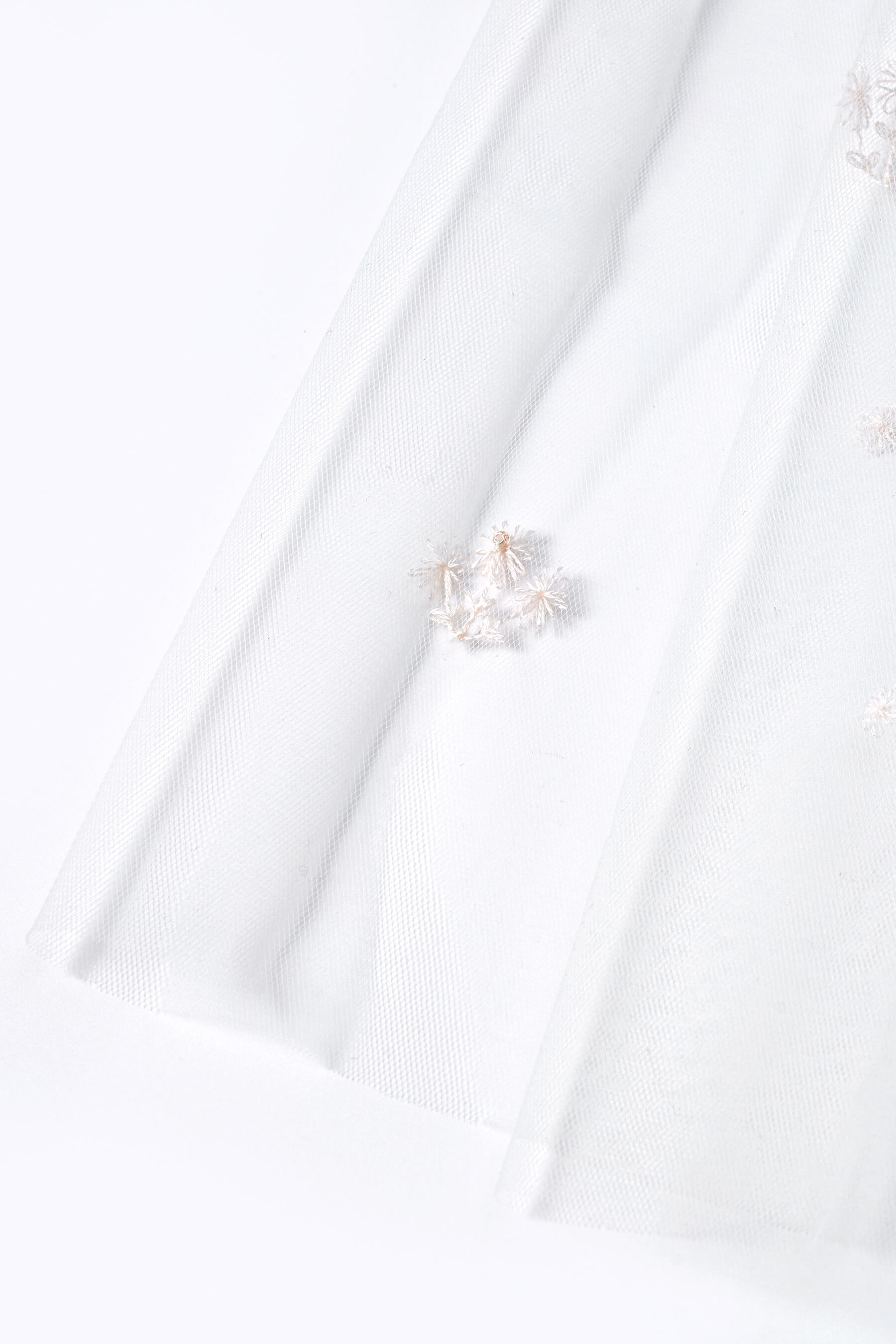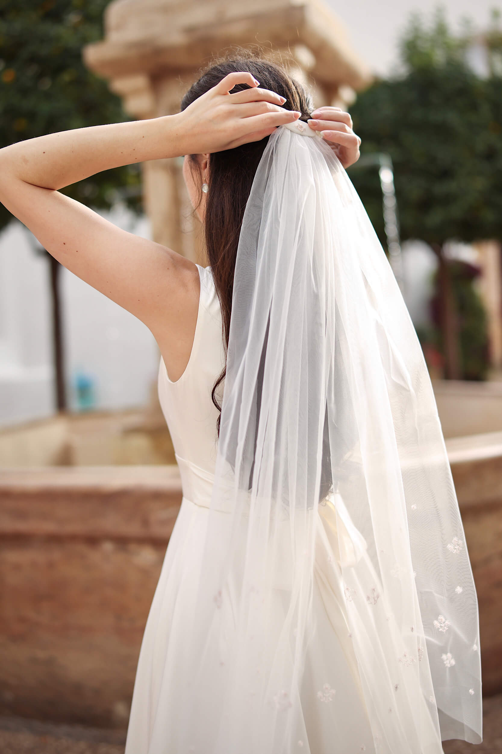 This bridal veil is created from upcycled polyester and features intricate floral motifs hand-embroidered by talented European artisans. The design is enhanced with delicate beading and attached by a hairclip for a secure fit, measuring 80 cm in length.
